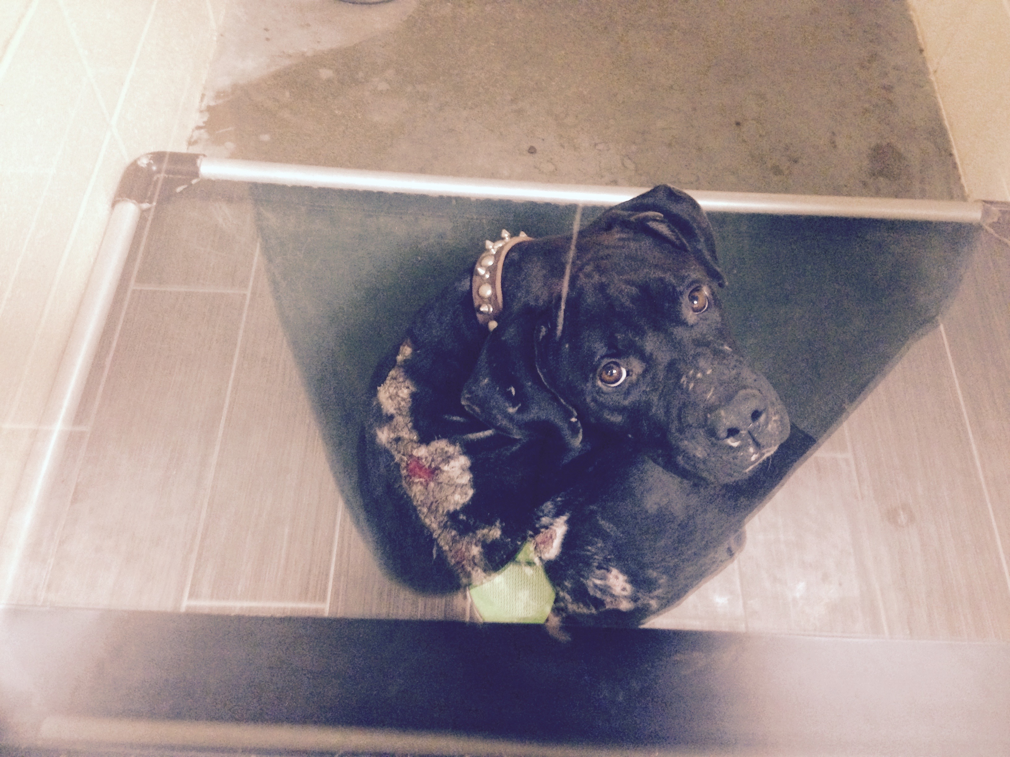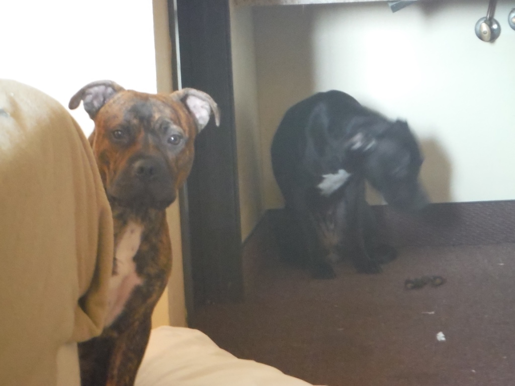 The dog stops barking. Thats when I see the other black dog cowering under a sink. He’s protecting her. He comes toward me, unsure but calm now.