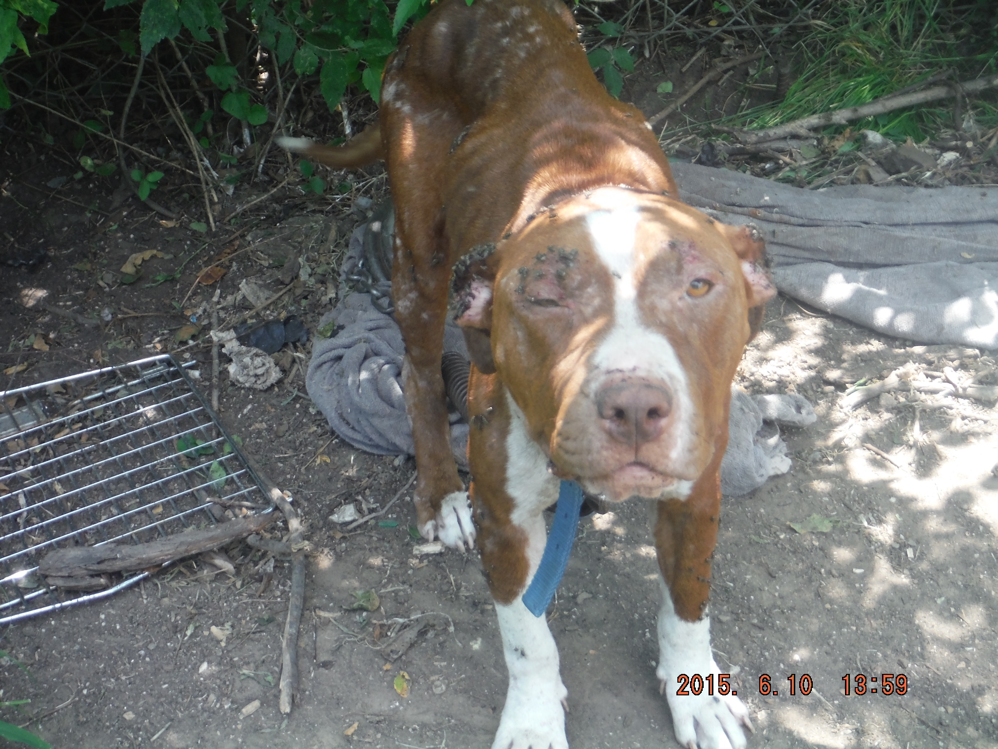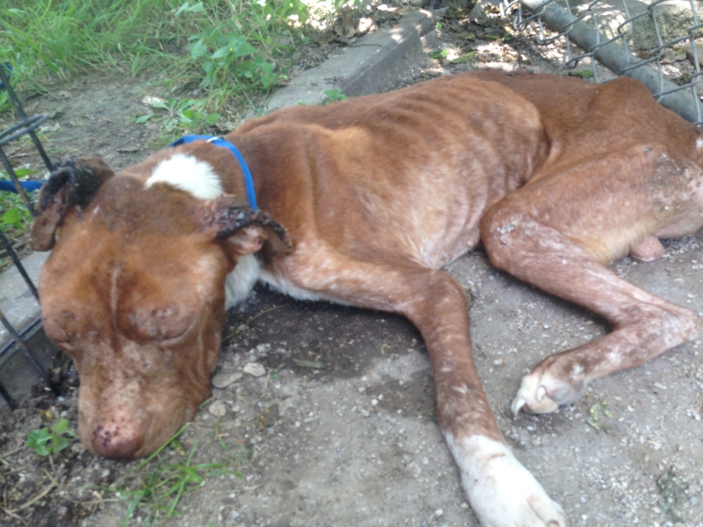 The cruelty officer has seen hundreds of emaciated animals with open, maggot infested wounds. Even he cringes at a puppy so emaciated that his pointed hipbone has broken through the skin from being unable to get up. The mother dog has a 25 pound bar-belle plate tied to her collar. The grass in the backyard so tall, that we heard the two pit bulls before we saw them. Flies swarm their ears and maggots crawl in their open wounds. The puppy is so weak that he falls every time he tries to get up. His furless white skinned body has created a small pit from repeatedly trying.