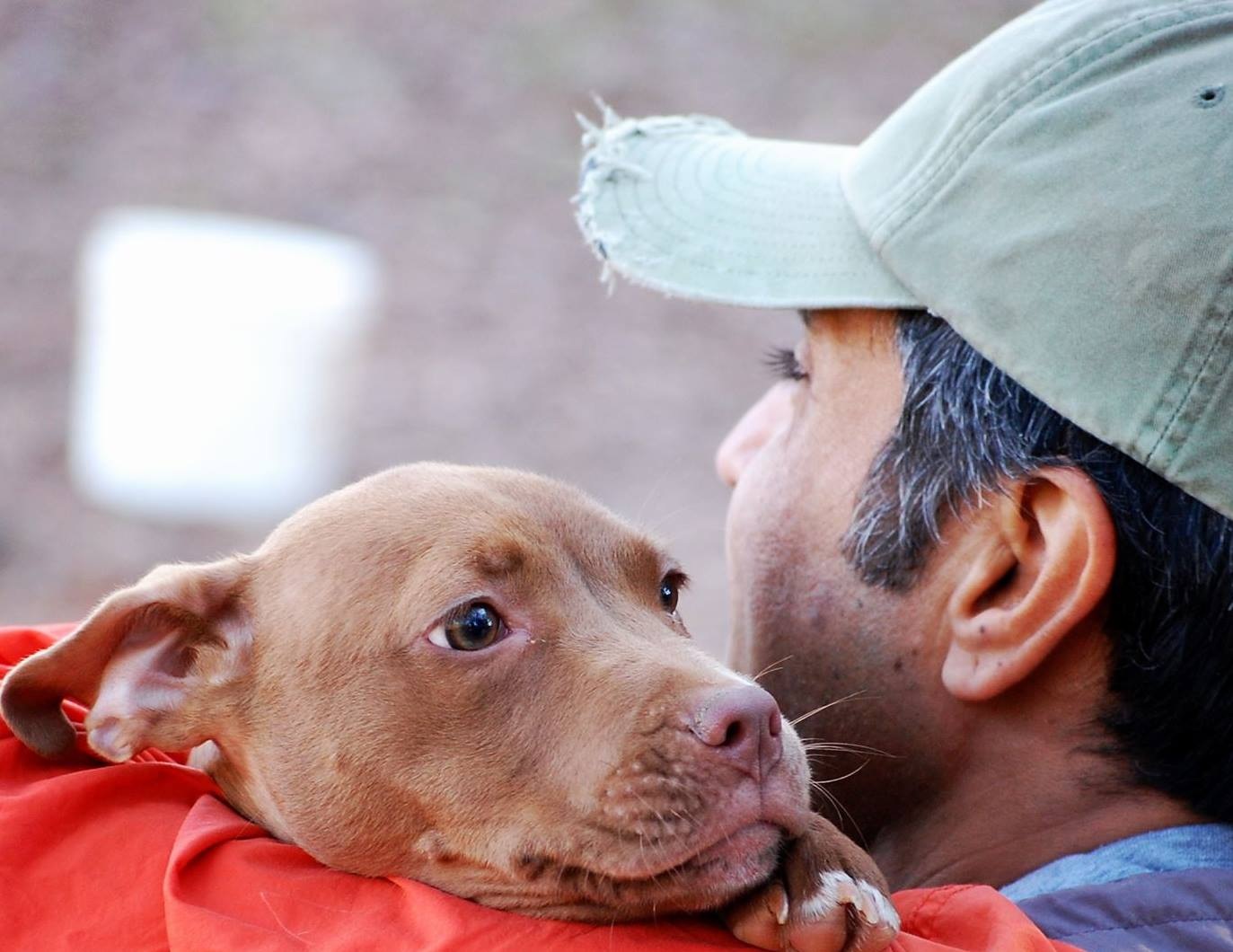 A few months ago Sophie lived by the railroad tracks and a church in the Wayside area of Houston, Texas. A shattered front leg caused her to limp up and down the tracks but when Joel: a local factory worker showed her some love –she warmed up to him right away.