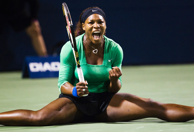 Serena WIlliams of the US does the splits as she celebrates a point against Kie Zheng of China during their third round match at the Rogers Cup women’s tennis tournament in Toronto, August 11, 2011. REUTERS/Mark Blinch (CANADA)